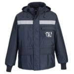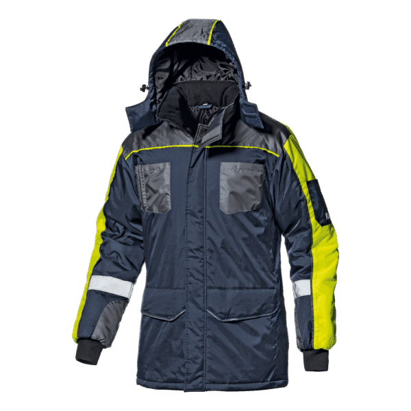 Značilnosti: Jakna za hladilnice je certificirana za zaščito pred nizkimi temperaturami do -60 °C. Jakna s skrito dvosmerno zadrgo in gumbi, ovratnik, zaprt z dvojnim ježkom, podloga ovratnika iz mikroflisa, žep, ki se zapenja z ježkom na levem rokavu, elastične pletene manšete, snemljiva oblazinjena kapuca z vrvico za zategovanje, vrvica na spodnjem delu. Fluorescentno rumeni in sivi vstavki, dva prsna žepa z ježkom in držalom za pisala, dva spodnja žepa z zavihkom in ježkom, notranji žep. Odsevni trakovi in obrobe.